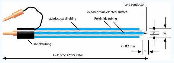 在部分產(chǎn)品代碼中含有KT意指Kapton管,從導(dǎo)體上延伸至尖端5毫米之內(nèi),這樣給電極柄提供堅(jiān)硬和額外的絕緣體。如果電極要通過一根導(dǎo)管做很深的穿透實(shí)驗(yàn)時(shí),我們推薦使用鍍Kapton的電極。