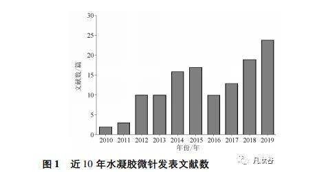 與傳統的遞藥途徑(如口服,注射)相比,透皮給藥主要在皮膚上放置微針貼片,穿刺皮膚角質層,通過皮膚組織將藥物輸送到血液中,因具有自我給藥、按需給藥、患者順應性好、避免肝臟的首過效應和胃腸道的藥物降解等優點而備受關注[4]。滲透增強技術的迅速發展克服了角質層的屏障障礙,拓寬了透皮給藥在藥物化療、基因治療、疫苗傳遞等領域的應用[5]。微針(microneedles)由單個或多個微米級別的針頭組成,直徑一般為幾百微米,高度可達毫米級別,可分為固體微針(solid microneedles)、中空微針(hollow microneedles)、涂層微針(coated microneedles)、溶解微針(dissolvable microneedles)和水凝膠微針(hydrogel microneedles),在美容、治療及診斷等領域有著廣闊的應用前景。水凝膠微針分為天然水凝膠微針與合成水凝膠微針,分別由天然高分子(如透明質酸、明膠、瓊脂等)和合成高分子(如聚乙烯醇、聚丙烯酸鈉、甲基丙烯酸類聚合物等)所制備[6],其中一些聚合物由于具有良好的生物相容性、可降解性和無毒性而受到越來越多的關注[7],使得水凝膠微針成為了微針領域的研究熱點之一。筆者從水凝膠微針的形成機制、應用研究以及存在的一些問題總結了近年國內外的相關代表文獻,并對這一領域的未來發展進行展望。在Web of Science以“hydrogel microneedle”為關鍵詞檢索近10年水凝膠微針發表的文獻情況,見圖1。