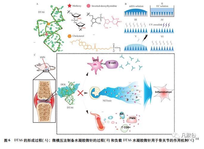 Cao等[32]研究了一種透明質酸水凝膠微針遞送化學修飾的適體用于類風濕性關節炎的治療。作者首先利用核糖糖單元上的甲氧基和反向脫氧胸苷DTA4修飾DTA(一種阻斷DEK蛋白的核酸適體),后用膽固醇在其5'端修飾DTA4,形成DTA6,裝載于甲基丙烯酸酯改性的透明質酸水凝膠微針,通過穿刺皮膚,快速釋放DTA6進入真皮。結果顯示,DTA6顯著降低炎癥RAW264.7細胞的DEK表達,保護小鼠關節免受軟骨/骨侵蝕。相對于可溶性微針的給藥方式,水凝膠微針不僅可增加核酸適體填充到微針模具空腔的裝載量,還可以通過調節適體溶液的濃度來控制水凝膠微針的負載量,避免了制備過程適體的浪費和損失,見圖6。