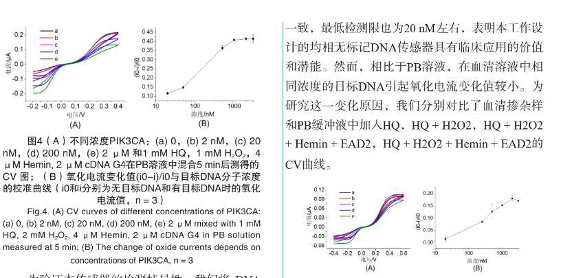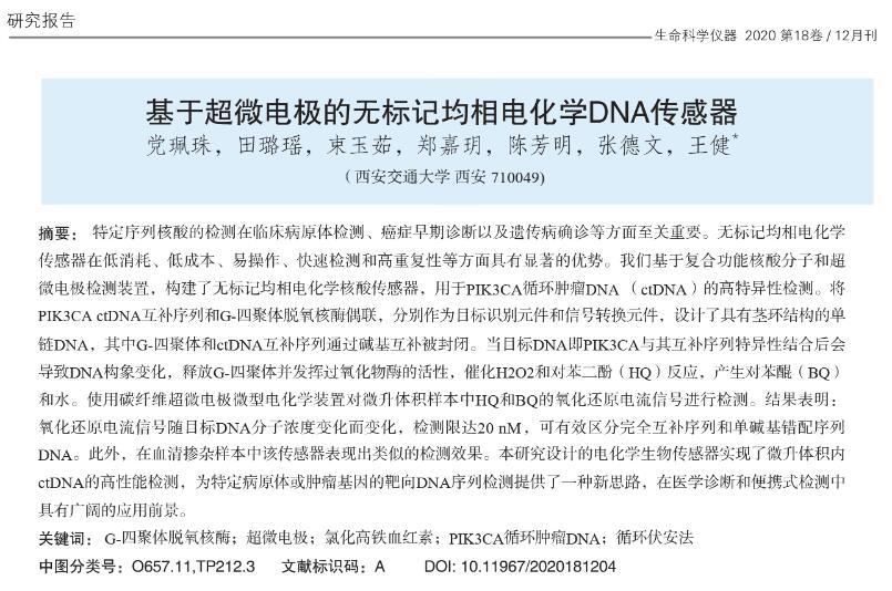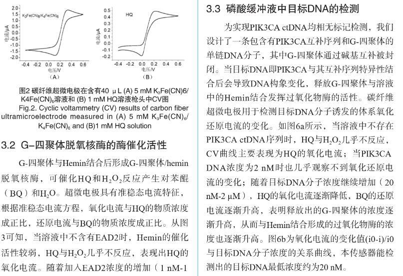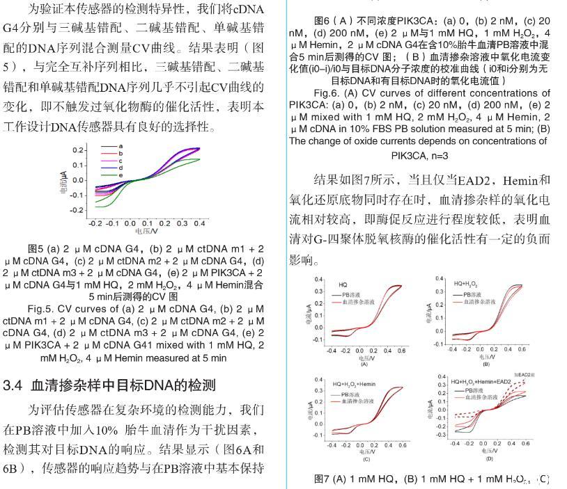【摘要】:特定序列核酸的檢測在臨床病原體檢測、癌癥早期診斷以及遺傳病確診等方面至關重要。無標記均相電化學傳感器在低消耗、低成本、易操作、快速檢測和高重復性等方面具有顯著的優勢。我們基于復合功能核酸分子和超微電極檢測裝置,構建了無標記均相電化學核酸傳感器,用于PIK3CA循環腫瘤DNA(ctDNA)的高特異性檢測。將PIK3CA ctDNA互補序列和G-四聚體脫氧核酶偶聯,分別作為目標識別元件和信號轉換元件,設計了具有莖環結構的單鏈DNA,其中G-四聚體和ctDNA互補序列通過堿基互補被封閉。當目標DNA即PIK3CA與其互補序列特異性結合后會導致DNA構象變化,釋放G-四聚體并發揮過氧化物酶的活性,催化H2O2和對苯二酚(HQ)反應,產生對苯醌(BQ)和水。使用碳纖維超微電極微型電化學裝置對微升體積樣本中HQ和BQ的氧化還原電流信號進行檢測。結果表明:氧化還原電流信號隨目標DNA分子濃度變化而變化,檢測限達20 nM,可有效區分完全互補序列和單堿基錯配序列DNA。此外,在血清摻雜樣本中該傳感器表現出類似的檢測效果。本研究設計的電化學生物傳感器實現了微升體積內ctDNA的高性能檢測,為特定病原體或腫瘤基因的靶向DNA序列檢測提供了一種新思路,在醫學診斷和便攜式檢測中具有廣闊的應用前景。