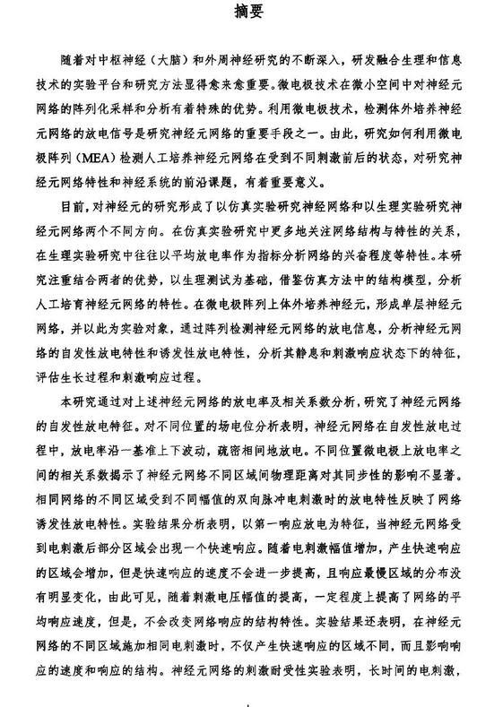 【摘要】:隨著對(duì)中樞神經(jīng)(大腦)和外周神經(jīng)研究的不斷深入,研發(fā)融合生理和信息技術(shù)的實(shí)驗(yàn)平臺(tái)和研究方法顯得愈來(lái)愈重要。微電極技術(shù)在微小空間中對(duì)神經(jīng)元網(wǎng)絡(luò)的陣列化采樣和分析有著特殊的優(yōu)勢(shì)。利用微電極技術(shù),檢測(cè)體外培養(yǎng)神經(jīng)元網(wǎng)絡(luò)的放電信號(hào)是研究神經(jīng)元網(wǎng)絡(luò)的重要手段之一。