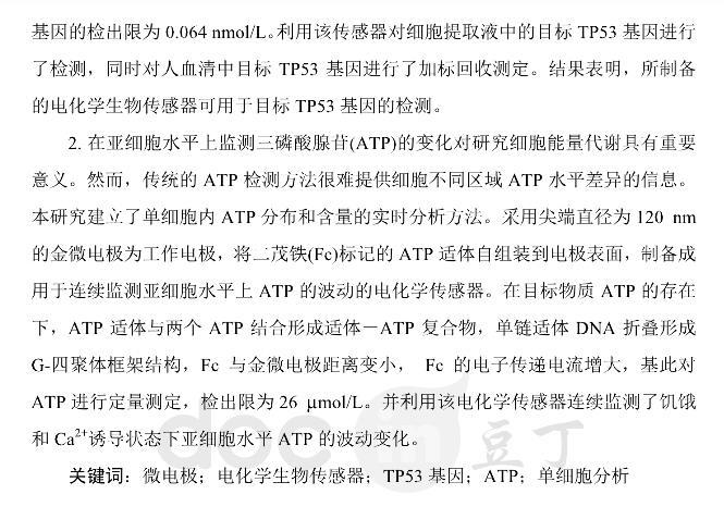 一些傳統的方法或存在取樣體積大、分析時間長及靈敏度低等缺點,難以適用于單細胞的分析,且獲取單個細胞中生物分子化學信息的檢測方法有限。電化學方法因其設備簡單,不需要使用探針對目標進行標記,很大程度上減小了對細胞正常生理機能的擾動。同時,由于收集電化學信號無需受到光學衍射極限的限制,單細胞電化學分析方法不需要以時間分辨率為代價實現高空間分辨率。制備微電極能力以及納米電化學理論快速發展,顯著提高了電化學測量的檢測極限、特異性和分辨率。因此,電化學分析方法成為正在迅速發展的單細胞分析方法。本論文的研究目的是制備新型的金微電極電化學生物傳感器,建立對TP53基因的檢測及亞細胞水平上ATP的波動連續監測的電化學新方法。主要研究內容如下:1.TP53基因是重要的抑癌基因之一。TP53基因檢測方法對腫瘤疾病的早期診斷和預后具有重要意義。