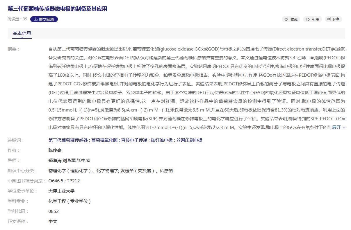 【摘要】:自從第三代葡萄糖傳感器的概念被提出以來,葡萄糖氧化酶(glucose oxidase,GOx或GOD)與電極之間的直接電子傳遞(Direct electron transfer,DET)問題就備受研究者的關注。對GOx在電極表面DET的認識對構建新的第三代葡萄糖傳感器具有重要的意義。本文通過恒電位技術將聚3,4-乙烯二氧噻吩(PEDOT)修飾到碳纖維微電極上,方便地在碳纖維微電極上構建了多孔的表面修飾層。實驗結果表明PEDOT具有優良的電化學活性,修飾電極的電活性表面積比裸電極提高了100倍以上。同時,修飾電極的異相電子轉移能力和金、鉑等貴金屬微電極相當。