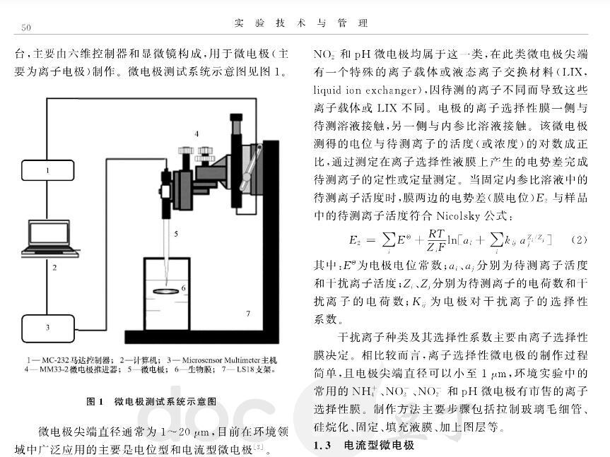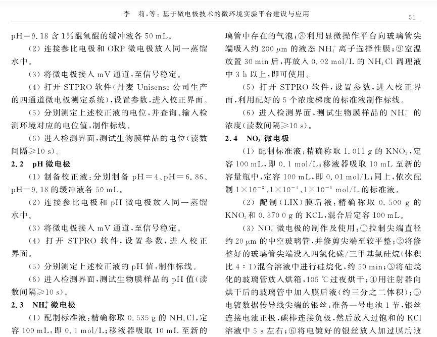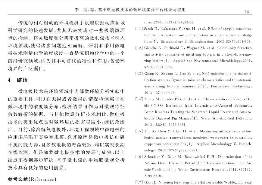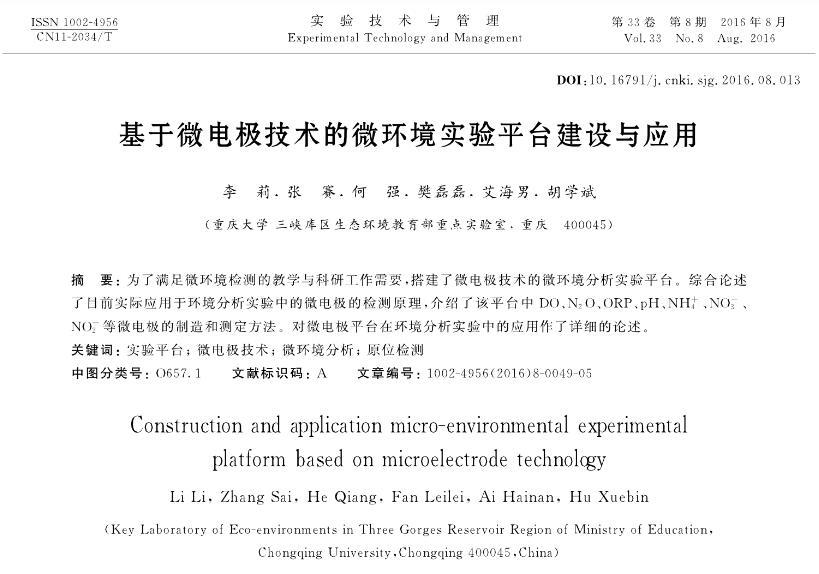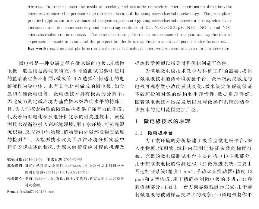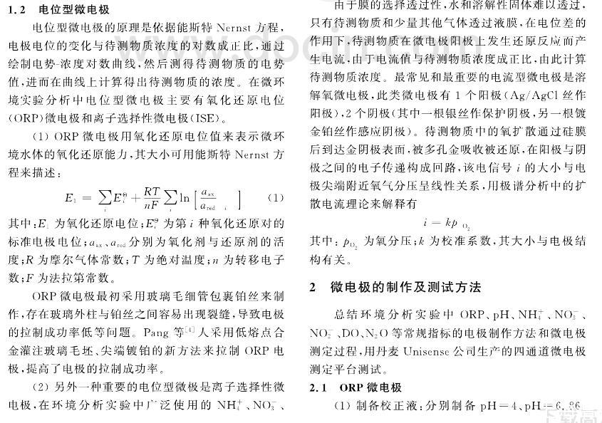 【摘要】:為了滿足微環(huán)境檢測的教學與科研工作需要,搭建了微電極技術的微環(huán)境分析實驗平臺。綜合論述了目前實際應用于環(huán)境分析實驗中的微電極的檢測原理,介紹了該平臺中DO、N2O、ORP、pH、NH+4、NO-3、NO-2等微電極的制造和測定方法。對微電極平臺在環(huán)境分析實驗中的應用作了詳細的論述。