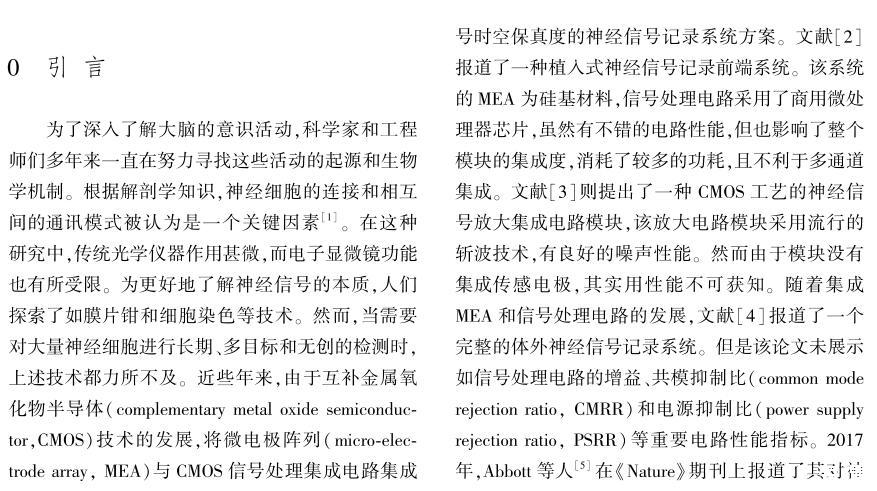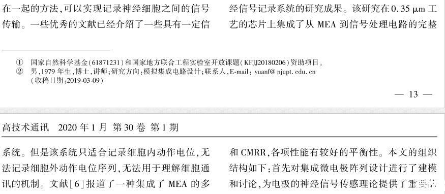 【摘要】:設計實現了集成信號處理電路的互補金屬氧化物半導體(CMOS)神經細胞信號記錄微電極陣列系統。首先,建立了電極-神經細胞界面模型,通過解析推導及仿真揭示了采用電極記錄神經細胞信號的一些結論,為設計良好的微電極陣列(MEA)提供了理論依據。其次,設計了新型的跨導運算放大器(OTA),在較低的電源電壓和功率下,保持了合適的增益、電源抑制比(PSRR)、共模抑制比(CMRR)和較低的噪聲。再次,利用有源低頻抑制放大技術,提出了一種系統拓撲結構,彌補了傳統電容耦合放大結構的缺點。所設計實現系統的各項性能有較好的平衡性,為記錄神經信號提供了有效的手段。