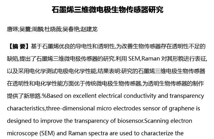 【摘要】:基于石墨烯優良的導電性和透明性,為改善生物傳感器存在透明性不足的缺陷,提出了石墨烯三維微電極傳感器的研究。利用SEM,Raman對其形貌進行表征,以及采用電化學測試電極電化學性能,結果表明:研究的石墨烯三維電極生物傳感器在透明性和電化學性能方面優于傳統微電極生物傳感器,為透明生物傳感器的制作提供了新思路。