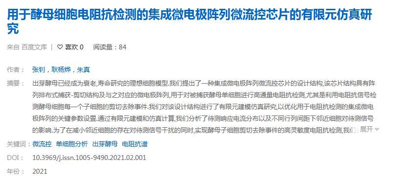 【摘要】:出芽酵母已經(jīng)成為衰老、壽命研究的理想細(xì)胞模型。我們提出了一種集成微電極陣列微流控芯片的設(shè)計(jì)結(jié)構(gòu),該芯片結(jié)構(gòu)具有陣列排布式捕獲-剪切結(jié)構(gòu)及與之對(duì)應(yīng)的微電極陣列,用于對(duì)被捕獲酵母單細(xì)胞進(jìn)行高通量電阻抗檢測(cè),尤其是利用電阻抗信號(hào)檢測(cè)酵母細(xì)胞每一個(gè)子細(xì)胞的剪切去除事件。