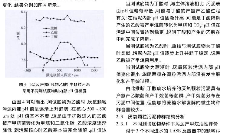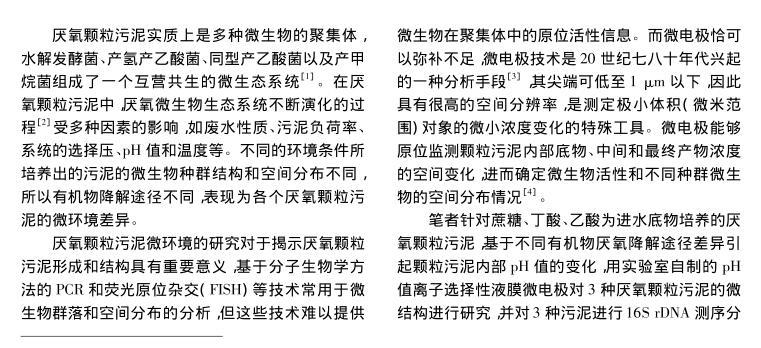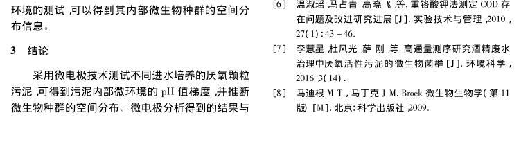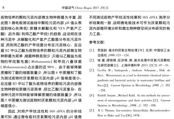 【摘要】:文章分別以蔗糖、乙酸和丁酸為進水唯一碳源,運行3個UASB反應器,當反應器穩(wěn)定運行后,采用自制氫離子選擇性液膜微電極對3種厭氧顆粒污泥進行內(nèi)部pH值梯度分析,并對厭氧顆粒污泥進行了多種測試底物的產(chǎn)甲烷活性分析和16S rDNA測序分析。結(jié)果表明,采用微電極技術(shù)可以準確測定厭氧顆粒污泥內(nèi)部的pH值梯度,并推斷微生物種群的空間分布,所得結(jié)果與產(chǎn)甲烷活性和16S rDNA測序分析結(jié)果相一致,說明微電極技術(shù)可作為厭氧顆粒污泥內(nèi)部微環(huán)境分析和微生物種群空間分布研究的有力工具。