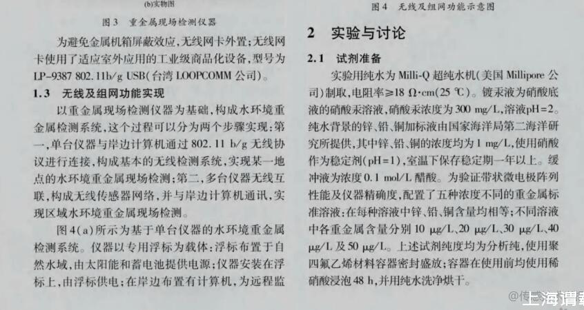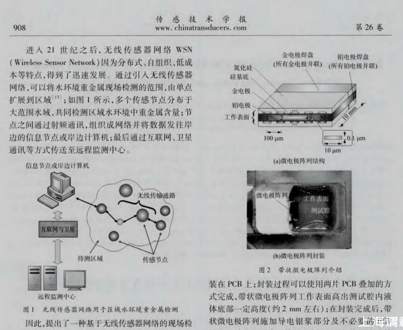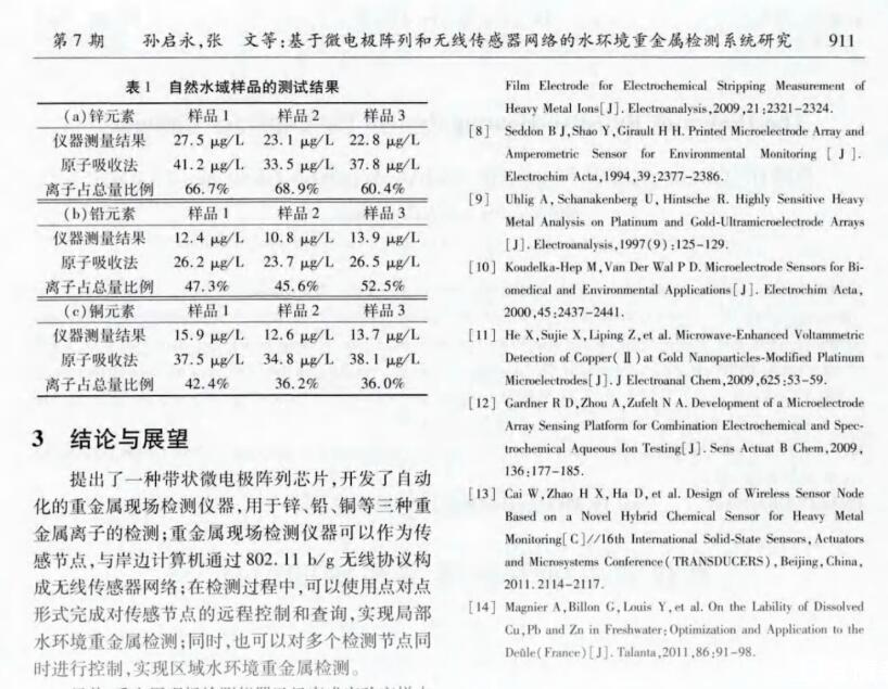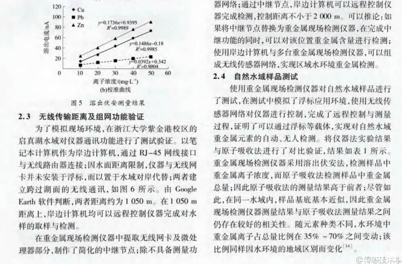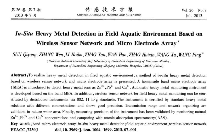 【摘要】:為對區(qū)域水環(huán)境中重金屬進行有效檢測,提出了一種基于微電極陣列和無線傳感器網(wǎng)絡(luò)的重金屬現(xiàn)場檢測技術(shù)。為此,提出了一種帶狀微電極陣列芯片,用于鋅、鉛、銅等三種重金屬離子的測量;基于帶狀微電極陣列芯片,開發(fā)了自動化的水環(huán)境重金屬現(xiàn)場檢測儀器;多臺儀器通過802.11 b/g無線協(xié)議組成無線傳感器網(wǎng)絡(luò),對區(qū)域水環(huán)境中的重金屬含量進行檢測。在實驗室通過重金屬標(biāo)準(zhǔn)溶液對儀器性能進行驗證,表明儀器具有較好的精確度;在自然水域進行了傳輸距離、無線組網(wǎng)測試;完成了自然水域樣品重金屬濃度檢測,并同原子吸收法進行了對比驗證。