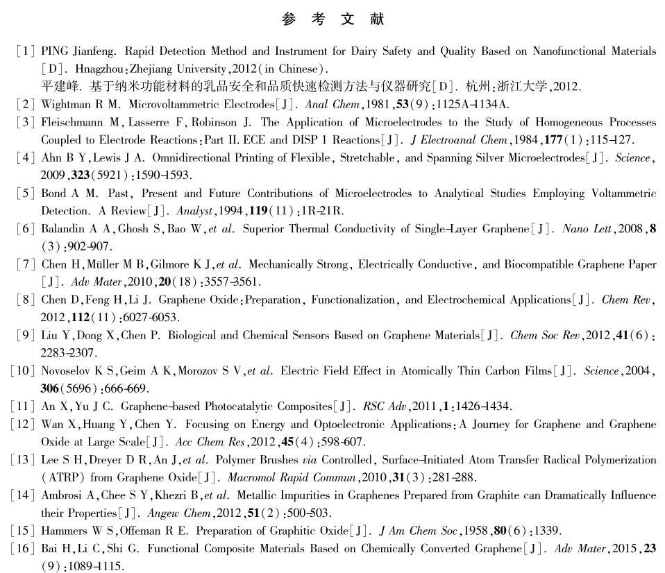 【摘要】:微電極由于靈敏度高、響應快、樣品用量少、操作簡便等特點,近年來在化學分析、生物醫學、食品安全、環境檢測等領域引起人們的廣泛關注。石墨烯具有超高的比表面積、優異的電子遷移率及良好的生物相容性等優點,近年來在電化學傳感領域展示出巨大的發展前景。