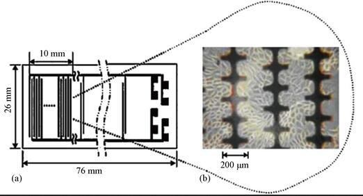 Figure 1.(a)Schematic diagram of interdigital microelectrode structure;(b)physical diagram of interdigital microelectrode