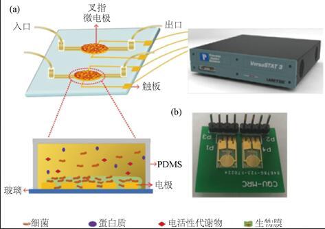 Figure 8.Biosensor chip for detecting biofilm formation process.(a)Schematic diagram of biofilm impedance detection system;(b)physical diagram of bio sensing chip 圖8.用于檢測生物膜形成過程的生物傳感器芯片。(a)生物膜阻抗檢測系統(tǒng)示意圖;(b)生物感應(yīng)晶片實物圖