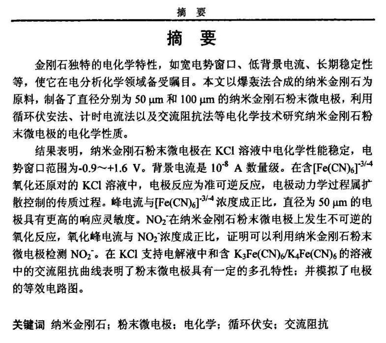 結(jié)果表明,納米金剛石粉末微電極在KCl溶液中電化學(xué)性能穩(wěn)定,電勢(shì)窗口范圍為-0.9~+1.6 V。背景電流是10-8 A數(shù)量級(jí)。在含[Fe(CN)_6]~(-3/-4)氧化還原對(duì)的KCl溶液中,電極反應(yīng)為準(zhǔn)可逆反應(yīng),電極動(dòng)力學(xué)過(guò)程屬擴(kuò)散控制的傳質(zhì)過(guò)程。峰電流與[Fe(CN)_6]~(-3/-4)濃度成正比,直徑為50μm的電極具有更高的響應(yīng)靈敏度。NO_2~-在納米金剛石粉末微電極上發(fā)生不可逆的氧化反應(yīng),氧化峰電流與NO_2~-濃度成正比,證明可以利用納米金剛石粉末微電極檢測(cè)NO_2~-。