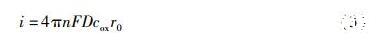 D為擴(kuò)散系數(shù),r?yàn)殡姌O半徑。r越小,擴(kuò)散速率越快。與此同時(shí),當(dāng)電極表面?zhèn)髻|(zhì)速率快時(shí),反應(yīng)物向電極表面?zhèn)鬏數(shù)倪^程中不受干擾。因此,可使用微電極研究速率較快的電化學(xué)反應(yīng)[28]。基于上述微電極傳質(zhì)規(guī)律可得到微電極的穩(wěn)態(tài)擴(kuò)散電流,公式如下: