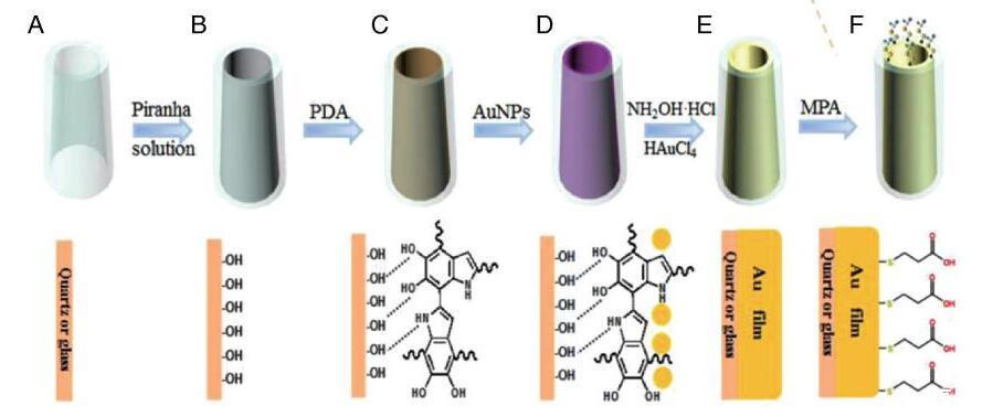 圖1金環(huán)微電極的制作步驟[12]。(A)拉制好的空玻璃毛細(xì)管;(B)毛細(xì)管內(nèi)壁羥基化;(C)毛細(xì)管內(nèi)壁自組裝上聚多巴胺層;(D)內(nèi)壁生長金納米粒子;(E)形成金膜;(F)金環(huán)微電極尖端修飾3?巰基丙酸