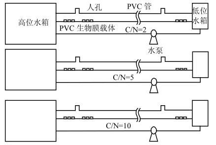 實(shí)驗(yàn)采用PVC材料制作的反應(yīng)器模擬排水管道.裝置示意如圖1所示,最上方為高位水箱,實(shí)驗(yàn)污水從3個(gè)等高的高位水箱流經(jīng)各個(gè)坡度相同的排水管道及中間水箱后到達(dá)各自的低位水箱,然后采用磁力循環(huán)泵將水轉(zhuǎn)移至高位水箱,由此進(jìn)行循環(huán),其中PVC管內(nèi)壁貼有PVC薄片作為生物膜生長(zhǎng)的載體.由于污水流動(dòng)過程中水力條件相同,因此,在同一批次實(shí)驗(yàn)過程中,3套反應(yīng)器中剪切力條件相同的,只有水質(zhì)條件不同.實(shí)驗(yàn)采用人工配水,配方見表1。為了更好的模擬真實(shí)廢水中的情況,配水中還加入了生物膜生長(zhǎng)所需的微量元素。