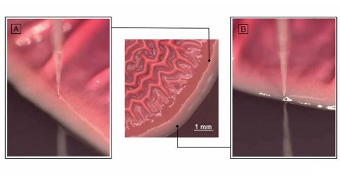 unisense微電極尖端插入生物膜的(A)生球區和(B)非生球區.