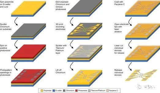 綜上所述,該研究提出的3D打?。p光子激光直寫)電極陣列的制造方法具有良好的魯棒性,并且與標準硅和柔性聚酰亞胺器件制造工藝完全兼容。使用高分辨率的雙光子激光直寫工藝可以制造出仿生針式電極和多孔電極等在內的各種獨特的電極形狀。這些器件將實現以當前3D電極無法達到的空間分辨率進行神經記錄。利用雙光子激光直寫、激光燒蝕、光刻和濺射設備,該研究中介紹的制造方法可以廣泛應用于研究機構的科學研究中。此外,如果未來有基金或行業合作伙伴支持這項研究工作,那么該技術可以為神經科學和神經工程以及人體應用提供新的工具,例如在視覺假體或神經接口中需要小尺寸、高密度的神經記錄和刺激電極陣列。