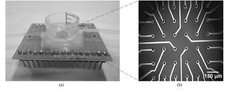 圖1器件。(a)封裝的器件;(b)電鍍鉑黑的MEA顯微照片