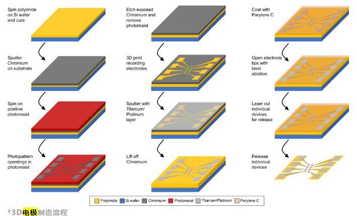 研究人員在硅襯底上制造了多孔電極用于刺激神經(jīng)元。使用金屬接觸焊盤和跡線直接在硅晶片上圖案化。然后用SU-8對跡線進行絕緣,并涂覆鉻犧牲層。SU-8層和鉻層都被圖案化,為印刷品和接觸焊盤打開窗口。電極結構被3D打印、金屬化,然后鉻被蝕刻以去除不需要的金屬。