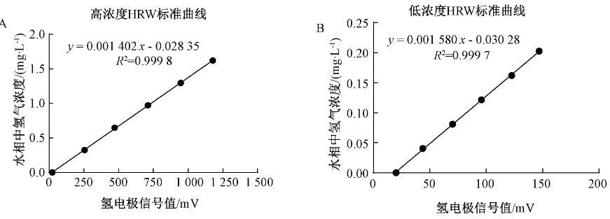 利用氫氣微電極分別測定高濃度HRW(0、0.324 0、0.648 0、0.972 0、1.296 0、1.620 0 mg·L-1)及低濃度HRW(0、0.040 5、0.081 0、0.121 5、0.162 0、0.202 5 mg·L-1)中氫氣的濃度。以水相中氫氣濃度為縱坐標,以氫電極的信號值為橫坐標,繪制標準曲線。如圖1A所示,高濃度HRW標準曲線方程為y=0.001 402x-0.028 35,相關系數(R2)為0.999 8;如圖1B所示,低濃度HRW標準曲線方程為y=0.001 580x-0.030 28,R2=0.999 7。因此,低濃度、高濃度HRW中,水相中氫氣濃度與氫氣微電極信號值之間均具有良好的線性關系。
