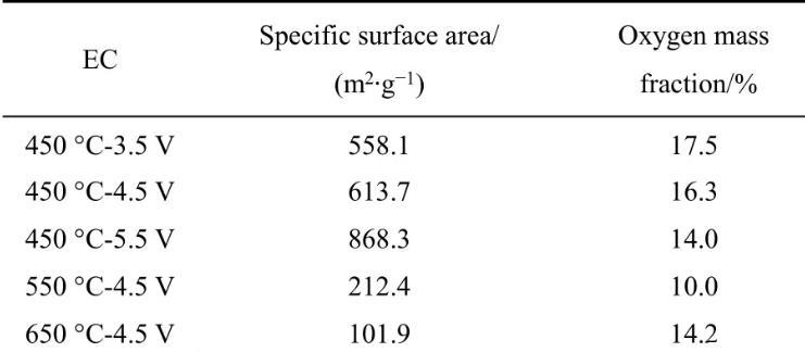 幾種通用碳材料在-0.6–0.6 V vs.SCE掃描電位區(qū)間內(nèi),CV曲線均接近于矩形,表現(xiàn)出明顯的雙電層電容特性,由負(fù)向正反掃時(shí)電流由充到放響應(yīng)迅速。與之顯著不同,在正向掃描階段,450°C-4.5 V-EC的CV曲線在-0.6–-0.21 V范圍內(nèi)仍存在負(fù)向充電電流,表現(xiàn)出明顯的“雙電層充放電響應(yīng)遲滯”現(xiàn)象。繼續(xù)正向掃描,正向電流出現(xiàn)且迅速增大,隨后出現(xiàn)明顯的陽(yáng)極電流峰。由于溶液中并無(wú)特殊的電活性反應(yīng)粒子,這種特異行為只能由電解碳材料特殊的表面化學(xué)特性和/或其引起的特殊的界面反應(yīng)特性所引起。
