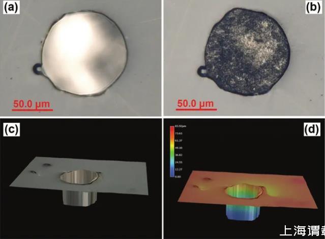 圖1粉末微電極填充碳粉前(a)、后(b)金相顯微圖,及微腔深度測(cè)量圖(c),(d)