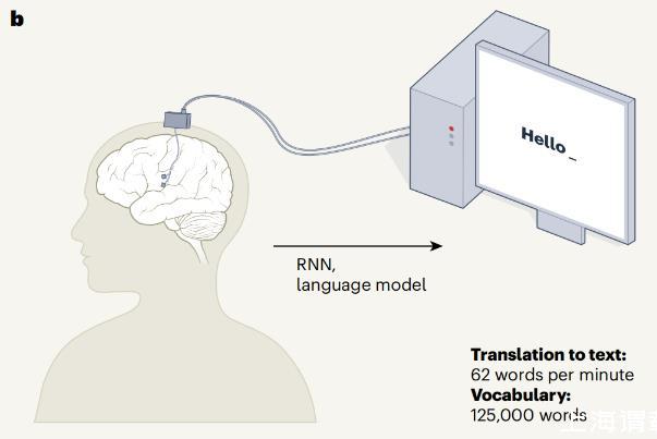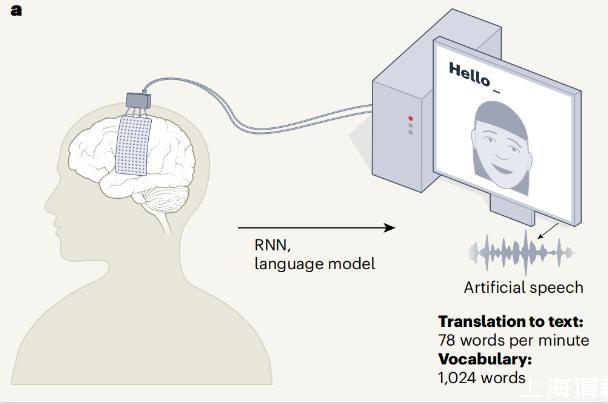 大腦對文本的解碼,第一種方法是通過循環神經網絡與語言模型這兩個系統的組合實現的,循環神經網絡(RNN,人工神經網絡的一種)的網絡運行的算法可破譯與發音器(聲道的一部分)運動相關的大腦活動;語言模型以每分鐘78個單詞的速度從一組單詞(1024個)中組成句子(組成的單詞錯誤率為25.5%)。第二種方法是,可以通過直接將大腦信號翻譯成合成語音,單詞詞匯量為1024個時,合成單詞錯誤率為54.4%;單詞詞匯量為119個時,合成單詞錯誤率為8.2%,詞匯量較少錯誤率會降低。此外,BCI還嘗試對面部表情進行解碼,并通過數字人像進行再現,從而為文本或語音提供視覺反饋,極大地豐富了參與者的交流能力??傮w而言,與之前報道的ECoG、BCI相比,該設備在詞匯量、通信速度和語音解碼的多功能性方面都有很大改進。