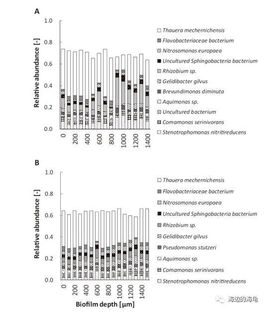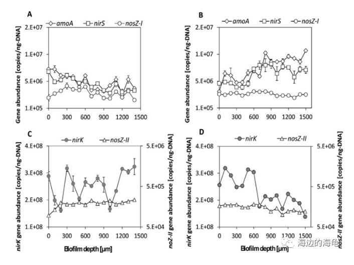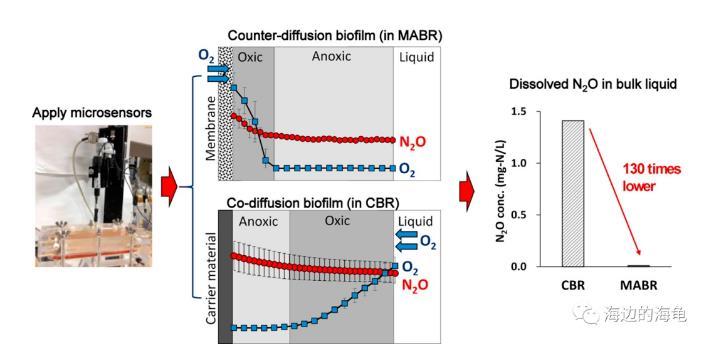 結論與展望:在本論文研究中,研究人員證明了SND的MABR可以減少N2O排放的概念。為此進行了反應器操作和原位生物膜深度研究此項研究揭示了(i)具有反擴散生物膜幾何形狀的MABR是否允許比具有共擴散生物膜幾何形狀的傳統生物膜反應器(CBR)更低的N2O排放量;(ii)N2O還原菌豐度和活性的空間分布如何變化,在生物膜反擴散生物膜中的微生物群落結構是否不同取決于生物膜的深度。為了解決這些研究問題,研究人員將微電極技術(unisense)原位的測試出膜生物反應器中生物膜中的氧氣及氧化亞氮的濃度,并與分子微生物學方法相結合。定量PCR和高通量測序技術16S rRNA基因擴增,比較反擴散和共擴散生物膜。本研究是第一次直接比較MABR和CBR在整體和空間分解的N2O產量/減少和作為生物膜深度功能的微生物群落組成方面的結果。2種生物膜分別采用逆流和共流基質擴散結構,在相同負荷率下,對低DOC/TDN為1.0的高含氮廢水進行同時硝化反硝化。上述研究結果證明了MABRs有望成為一種小足跡技術,既能實現有效的同步硝化/反硝化,又能減緩N2O排放。