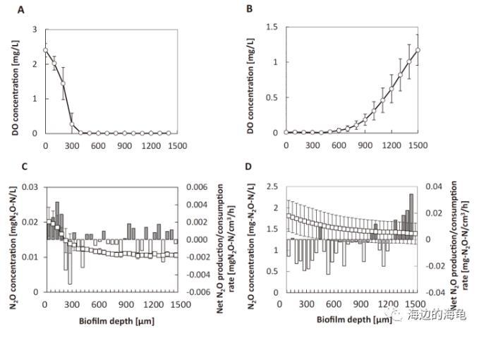使用Clarktype微電極(Unisense,丹麥)測量整個生物膜深度內溶解N2O和溶解氧(DO)濃度剖面,并連接皮安表(Unisense,奧爾胡斯,丹麥)進行數據采集。氧氣微電極和N2O微電極的尖端直徑分別為50um和25um。在使用微電極測試生物膜之前,對每個微電極進行了校準。微操作器和微電極使用Sensor Trace Pro軟件精確控制微電極插入生物膜的位置(Unisense,丹麥)。在反應器運行的第90天和第95天,在插入微電極的中間端口的10-15個點,獲得了N2O和O2濃度的生物膜深度分布。在假定穩態條件下,利用菲克第二擴散定律,估算了各濃度分布下的平均N2O凈容量消耗/生產速率。