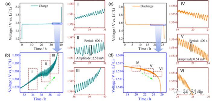 圖3.LTO單粒子微電極在15 nA電流下的恒電流充電(a,b)和放電(c,d)曲線的電化學振蕩及其放大圖。。