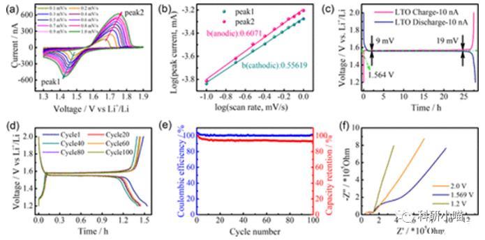 圖2.LTO單粒子微電極的電化學表征。(a)0.1-1.0 mVs–1的各種掃描速率下的CV曲線。(b)CV中提取的log(峰值電流)與log(掃描速率)的關系圖。(c)電流為10 nA時的GCD曲線。(d)50 nA電流下的第1、20、40、60、80和100條GCD曲線。(e)50 nA電流下的循環穩定性。(f)不同電位下的EIS曲線。