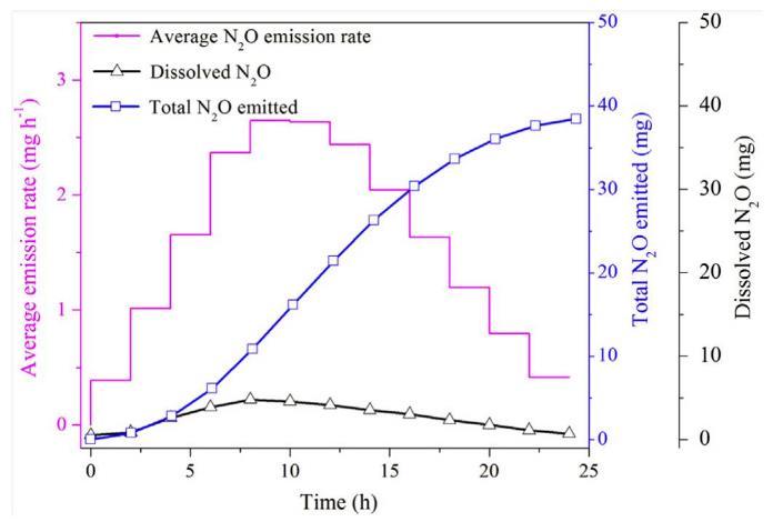 圖3、在SBBR的典型循環系統中,平均N 2O排放速率(mg/h),總N 2O排放(mg)和溶解N 2O(mg)。