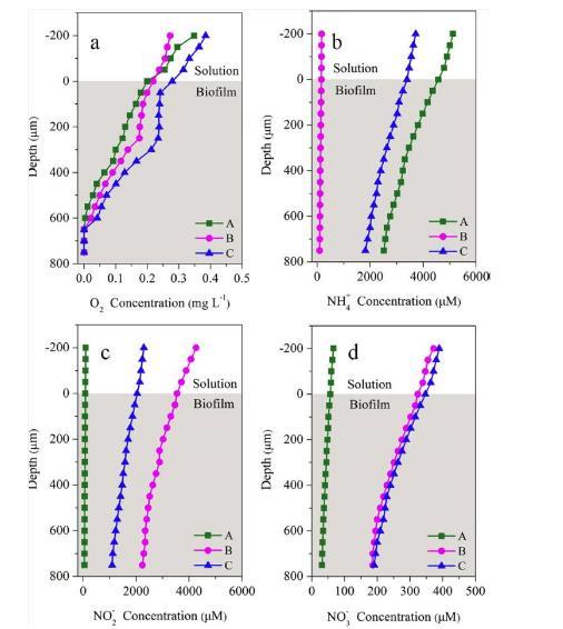 圖4、測試生物膜內的O2,NH4+,NO2-和NO3-。其中試驗A,B和C在所述生物膜內的O2,NH4+,NO2-和NO3–是4小時后測試的。