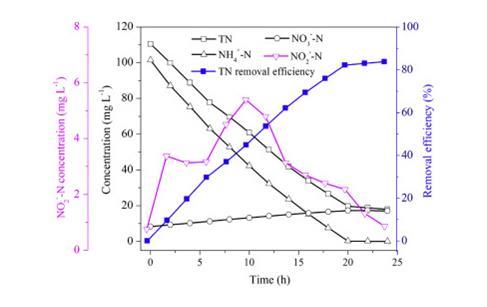 圖2、在SBBR的典型循環過程中,NH4+-N,NO2--N,NO3-N和TN的變化.
