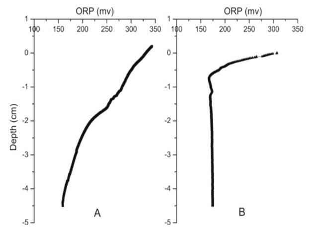 圖2、INT站點(A)和FW站點(B)沉積物中ORP的剖面變化。對于孔隙水中ORP的變化,在0.5 cm左右的FW部位觀察到了很強的氧化還原邊界,在INT點沉積物中,ORP隨深度的增加顯示氧化還原穩定下降,而沒有明顯的氧化還原邊界,因于INT站點的沉積物反復進行潮汐沖洗和一些沉積物遷移,兩者都會導致一定程度的氧化,從而阻止了陡峭的氧化還原邊界的形成。