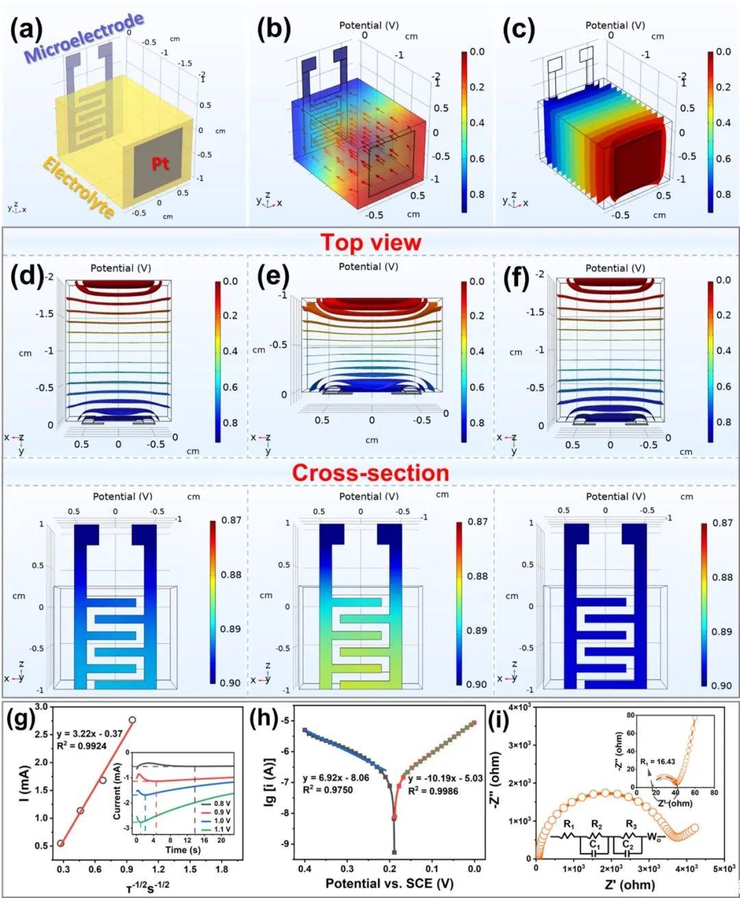 圖1.(a)雙電極電沉積池示意圖;(b)電流方向和(c)兩電極間電位梯度分布圖;基于不同電導率和電極間距的沉積液電導率俯視圖和電極表面截面圖:(d)30 S m-1和2 cm,(e)30 S m-1和1 cm,(f)10 S m-1和2 cm。(g)響應電流(I)與基于Cottrell方程的過渡時間(τ)的關系,插圖為電沉積過程中的電流-時間曲線;(h)微型金集流體電極的塔菲爾曲線和(i)奈奎斯特圖,插圖為等效電路。