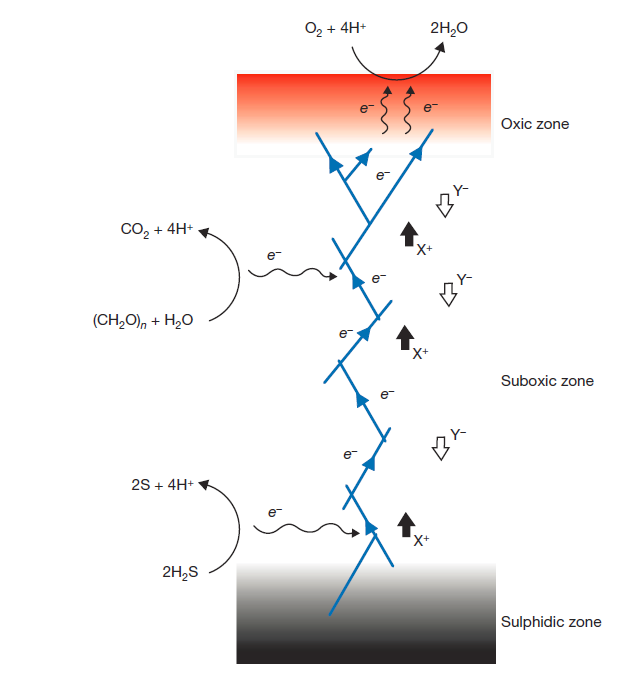 圖2沉積物中的電流。有氧區(qū)域的O2還原過程與低氧的硫化物區(qū)域H2S和有機碳的氧化過程之間電子交流的概念性圖解。