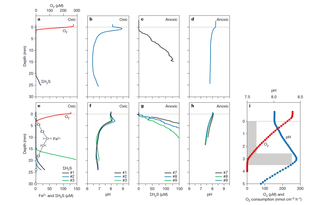 圖1沉積物中O2、∑H2S、Fe2+和pH的剖面圖。a–d:O2滲透較淺的沉積物(奧胡斯港);e–i:O2滲透較深的沉積物(奧胡斯灣)。沉積物在有氧(a、b、e、f、i)或無氧(c、d、g、h)上覆水里培養(yǎng)1個月。i:奧胡斯灣沉積物上層5 mm區(qū)域中的pH(藍色)、O2(紅色)、O2消耗(灰色)剖面圖。測量H2S和pH的深度分辨率為250μm、O2的測量步進為150μm。