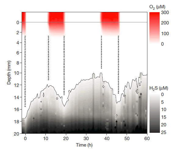 圖3在有氧-缺氧循環(huán)中,O2和H2S在沉積物中分布的時間序列。硫化物區(qū)域(實線)變動的上邊界為1μM H2S(H2S微電極的檢測限)。有氧-缺氧的轉(zhuǎn)變用垂直線來劃分。在時間零點,沉積物已經(jīng)在空氣飽和的上覆海水中培養(yǎng)了45天。在上覆水氧氣耗盡的3個時期緩慢通入Ar-CO2混合物以代替空氣。H2S和O2垂直剖面圖的記錄步進均為250μm,H2S的深度間距為10~20 mm深度,O2為–5~5 mm深度。