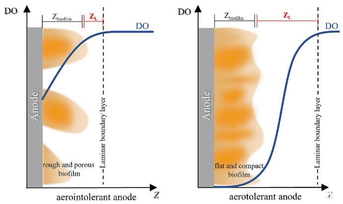 圖4、耐氣陽極和不耐氣陽極示意圖。Z生物膜和ZL分別指陽極生物膜和層流邊界層的厚度。使用氧微傳感器測量溶解氧濃度并評估層流邊界層的厚度。