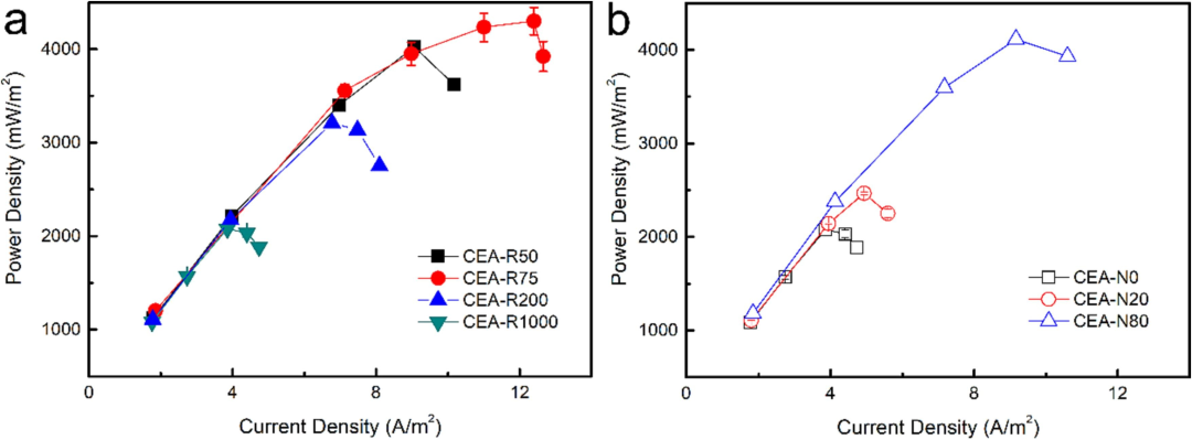 圖2、由(a)富含不同外部電路電阻的陽極,(b)富含不同氮氣噴射率的陽極構成的緊湊型電極MFC的功率密度。隨著外電阻從1000Ω減小到75Ω或氮氣鼓泡速率從20 mL/min增加到80 mL/min,CEA-R200、CEA-R75和CEA-N80的最大功率密度增加了38%、85%和77%至3223 mW/m2、4300 mW/m2和4114 mW/m2。