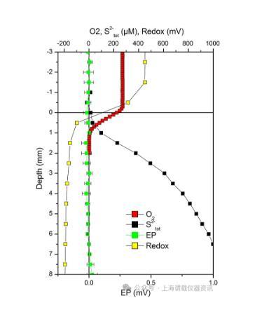 采用機動微剖面系統(Unisense A/S,丹麥)進行微傳感器定位和數據記錄。在測量每個垂直微剖面之前,在定義的位置進行的一系列測量,沿著軌跡的位置—沉積物表面的垂直位置首先是通過降低微傳感器和手動微機械手控制,同時觀察解剖過程中的非常尖端來確定的,顯微鏡下,它接近并接觸表面。垂直表面位置的確定精度約為100μm。當使用幾種類型的傳感器進行測量時,首先讓每個傳感器尖端與插入沉淀物的細玻璃絲尖端接近,然后用微操作器移動指定的水平距離。通過這種方法,可以確保在同一水平位置以大約100μm的精度測量一組沉積物微剖面。為了盡量減少之前在同一地點測量的干擾,測量O2、H2S和pH的微剖面的深度僅足以記錄氧氣和硫化物前沿面的相對位置以及氧化帶的pH變化。根據傳感器類型和沉積物深度的不同,微剖面的步長為50μm到1 mm。在一些沉積物樣品中,當電極向前移動時(即,在尖端方向),尖端開口的EPM信號表現出不穩定的變化,可能是由于顆粒堵塞了尖端開口。在這些情況下,通過從較深層開始并逐步向上向后測量剖面,使變化最小化。