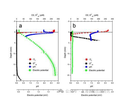 圖4、沉積物樣品中與生物地電流相關的電位梯度。(a)在孵育開始19天后測量O2、Sot2-、pH和EP微圖譜。(b)在孵育開始后4天(O2、Sot2-平均值和pH值)和5天(電勢)測量微剖面。數據點表示三個獨立剖面的平均值±標準誤差。注意,在圖6a中,2毫米以下的Sot2-總和是用2毫米深度的pH數據從H2S中計算出來的,因此并不精確。