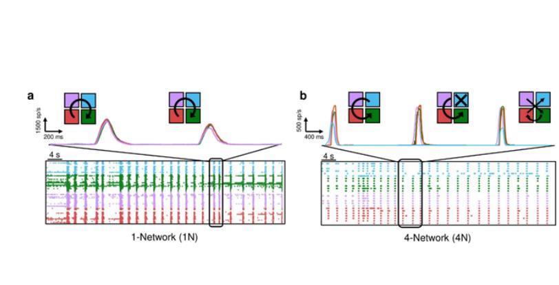 圖3.代表性的(a)單網(wǎng)絡(luò)(1N)和(b)四網(wǎng)絡(luò)系統(tǒng)(4N)的60 s電生理活動周期。5-s時間窗對應(yīng)的瞬時發(fā)射速率分布在頂部,以及簇激活序列的傳播圖草圖。每種顏色表示一個“虛擬”(1N)或4N集群,而箭頭表示集群之間的網(wǎng)絡(luò)爆發(fā)傳播。在1N的情況下,涉及到所有的虛擬集群,而在4N的情況下,第一次和第三次網(wǎng)絡(luò)爆發(fā)涉及到所有的集群,而第二次網(wǎng)絡(luò)爆發(fā)沒有涉及到青色集群。