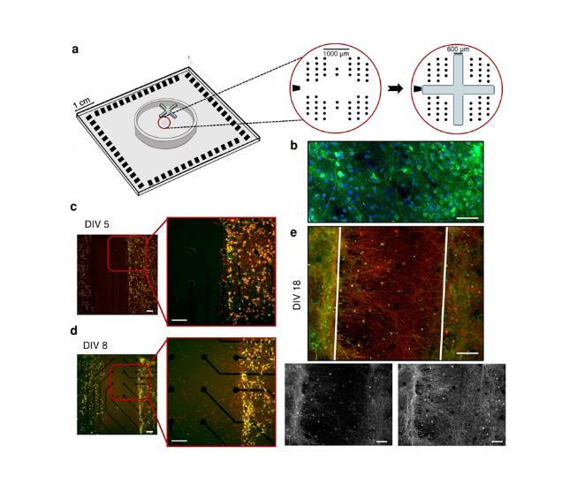 圖1.(a)十字形PDMS掩模在MEA上的定位。黑點(diǎn)表示電極位置;左邊的黑色梯形形狀代表參比電極。MEA的有效區(qū)域由1.8 mm×1.4 mm矩形的4個電極簇組成,其中每個電極簇由13個電極組成(?=30μm),另外7個電極位于簇之間。(b)具有代表性的四神經(jīng)網(wǎng)絡(luò)(4N)在體外(DIV)18天的免疫熒光圖像,其中樹突狀微管相關(guān)蛋白(MAP2,綠色)和細(xì)胞核(DAPI,藍(lán)色)被標(biāo)記。代表性4N培養(yǎng)物的免疫熒光圖像(c)在DIV 5,(d)DIV 8,(e)DIV 18。在兩個不同的神經(jīng)網(wǎng)絡(luò)(簇)之間建立軸突連接,其中樹突微管相關(guān)蛋白(MAP2,綠色)和軸突微管相關(guān)蛋白(Tau,紅色)被標(biāo)記。在DIV 5移除十字形掩膜。白色的疊加線劃定了之前被十字形掩模占據(jù)的區(qū)域。比例尺:100μm。