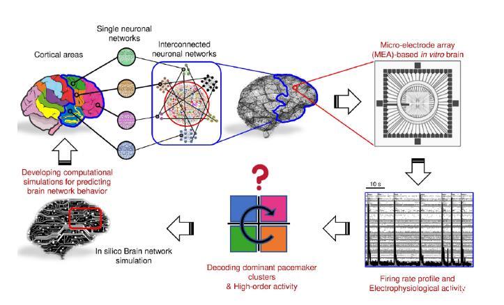 解鎖腦功能是探究病理性腦網(wǎng)絡(luò)功能障礙的必要條件。由于中樞神經(jīng)系統(tǒng)形態(tài)和生化的復(fù)雜性,開發(fā)具有預(yù)測能力的通用模型必須從體外腦網(wǎng)絡(luò)工程入手。基于此,本研究實(shí)現(xiàn)了一個基于微電極陣列(MEA)的體外腦網(wǎng)絡(luò),通過體外腦網(wǎng)絡(luò)對腦功能控制和病理性腦網(wǎng)絡(luò)功能障礙進(jìn)行了研究,并比較了不同類型的神經(jīng)元簇的動態(tài)特性。研究結(jié)果顯示,腦起搏神經(jīng)元在產(chǎn)生腦網(wǎng)絡(luò)電生理模式中起著重要作用,并可能與神經(jīng)可塑性過程有關(guān)。這些發(fā)現(xiàn)為未來的計(jì)算模型發(fā)展提供了有關(guān)生理和病理?xiàng)l件下腦網(wǎng)絡(luò)行為的重要信息。