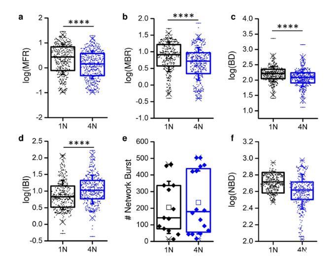圖2.單網(wǎng)絡(luò)(1N,黑色)和四網(wǎng)絡(luò)(4N,藍(lán)色)組件中的峰值和爆發(fā)活動。(a)平均發(fā)射速率(MFR),(b)平均爆發(fā)率(MBR),(c)爆發(fā)持續(xù)時間(BD),(d)爆發(fā)間隔(IBI),(e)網(wǎng)絡(luò)爆發(fā)數(shù),(f)網(wǎng)絡(luò)爆發(fā)持續(xù)時間(NBD)。(a-d、f)每個數(shù)據(jù)點(diǎn)表示相對于單個電極的特定度量(MFR,MBR等)的值。(e)每個數(shù)據(jù)點(diǎn)相對于多邊環(huán)境協(xié)定。
