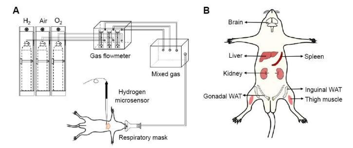 圖1:H2吸入裝置(A)和用于H2濃度測(cè)量的七種代表性目標(biāo)組織(B)。