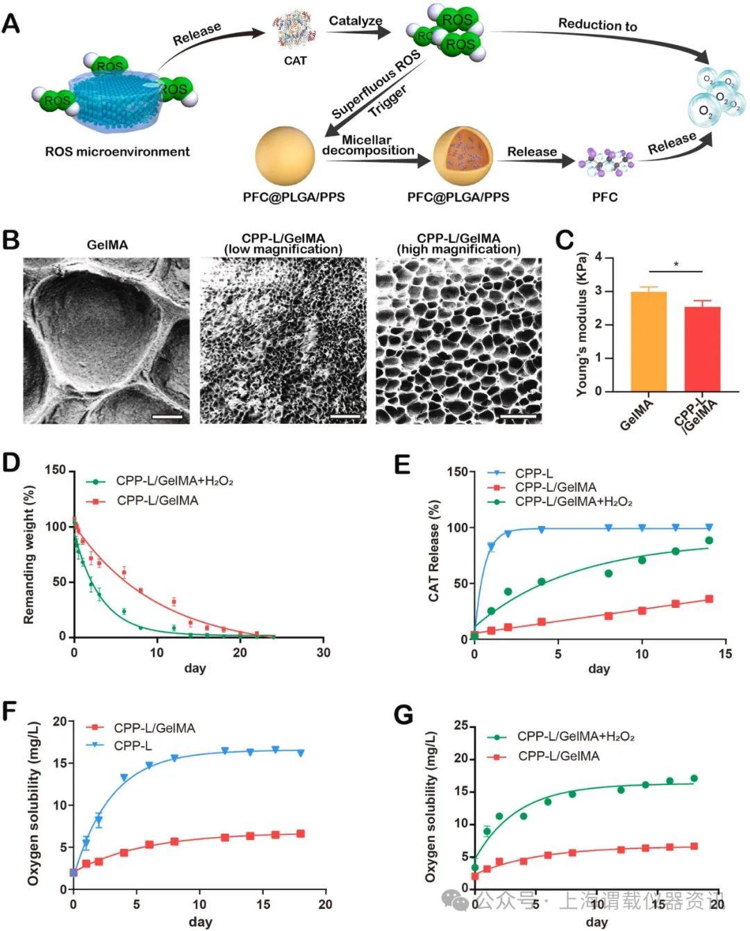 圖2、復合水凝膠的表征。(A)CPP-L/GelMA水凝膠清除ROS和智能供氧的示意圖。(B)GelMA水凝膠和CPP-L/GelMA水凝膠的代表性SEM圖像。(C)水凝膠的楊氏模量(n=3)。(D)CPP-L/GelMA水凝膠在不同條件下的降解(n=3)。(E)不同條件下CPP-L/GelMA水凝膠中CAT的釋放(n=3)。(F)CPP-L/GelMA水凝膠的氧氣釋放速率(n=3)。(G)不同條件下CPP-L/GelMA水凝膠的氧氣釋放率(n=3)。比例尺:B中GelMA和低放大倍數CPP-L/GelMA為20μm,B中CPP-L/GelMA高放大倍數為10μm。